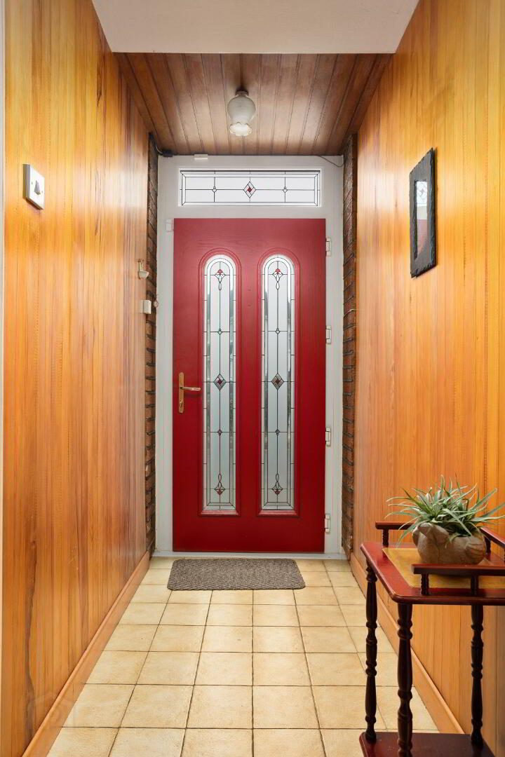 Entrance Porch: 2.15m x 1.16m with composite front door, tiled floor and timber panelling.
