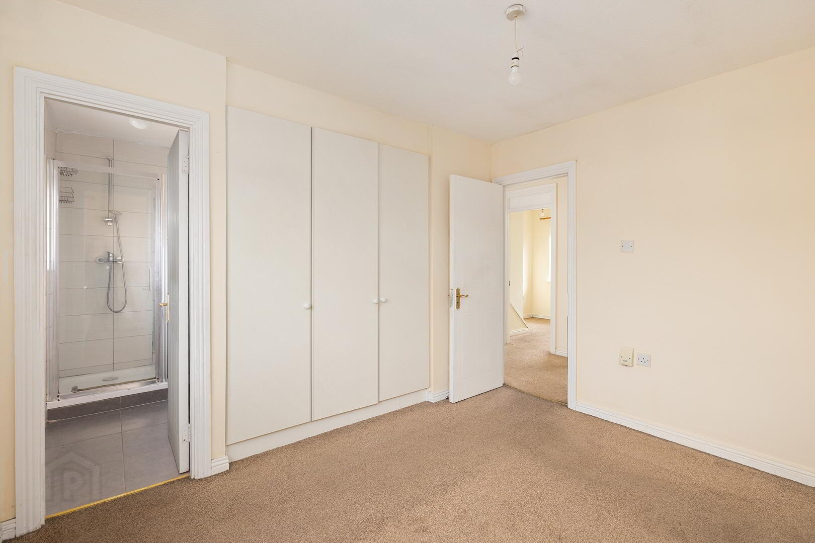En-suite fully tiled, tiled floor, shower enclosure, WC and WHB.