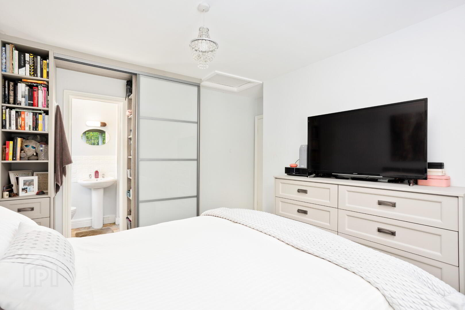 Ensuite: cleverly concealed access by sliding wardrobe, with Triton shower unit, wc, whb, extractor fan, window to side.