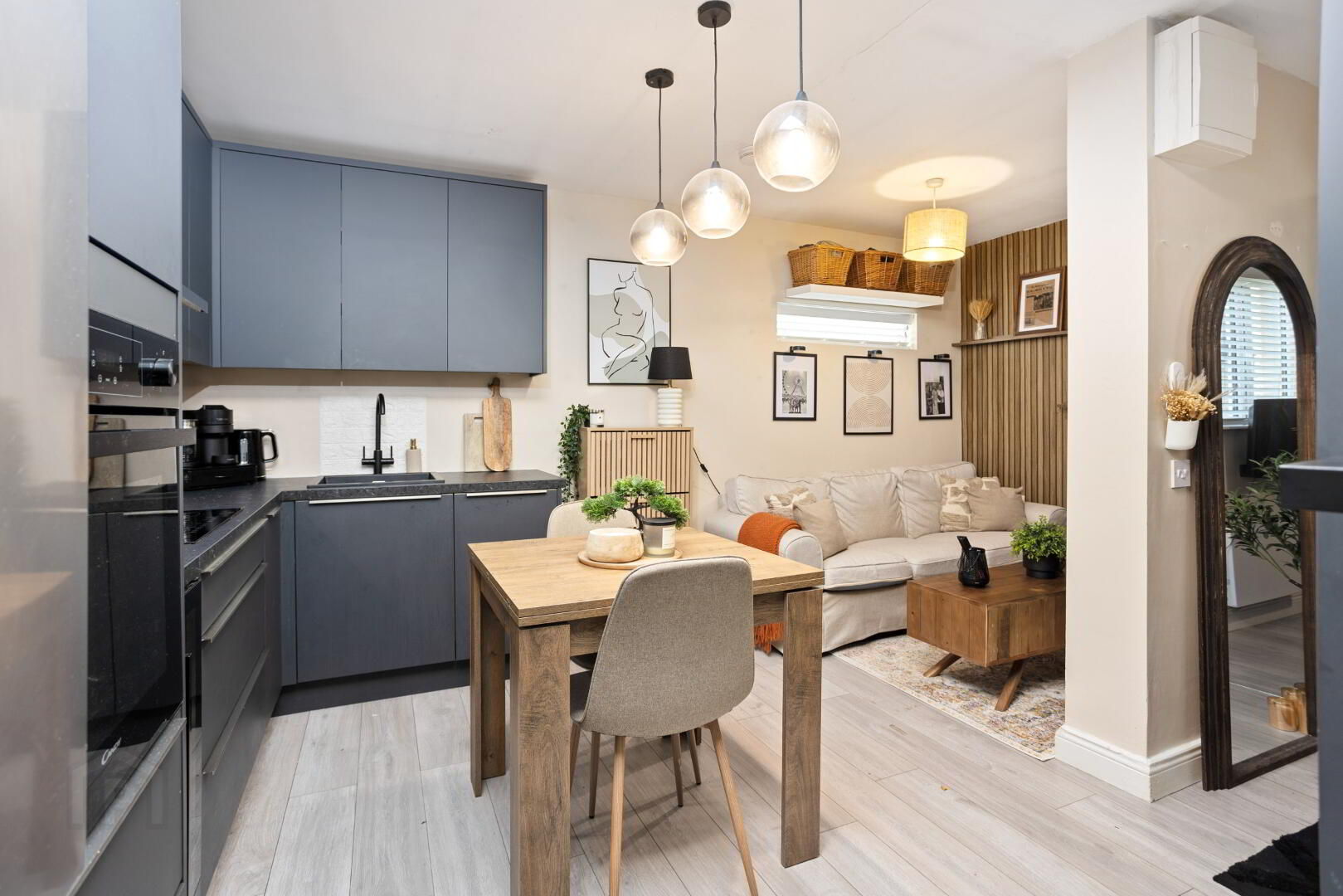 Living Room / Kitchen: with quality kitchen units at floor- and eye- level with soft closing and feature spice rack, Logik induction hob, Candy integrated oven, tile-effect splashback, integrated Kenwood dishwasher, Living Area: feature wall with built-in Dimplex i50 electric fire and feature wall inlay for mounted TV, skylight for additional lighting, Faber extractor fan, drop down pendant lighting in kitchen area.