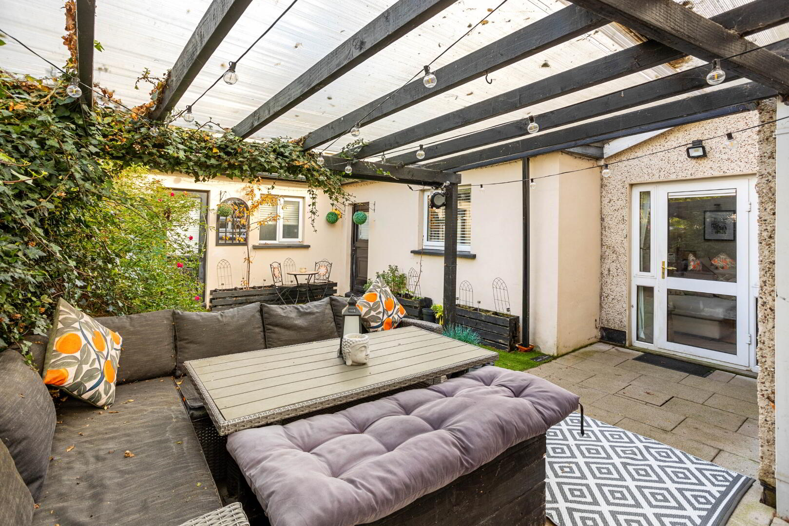 Large and private rear garden laid out part lawn and part raised patio area with quality covered Pergola with solar lighting.