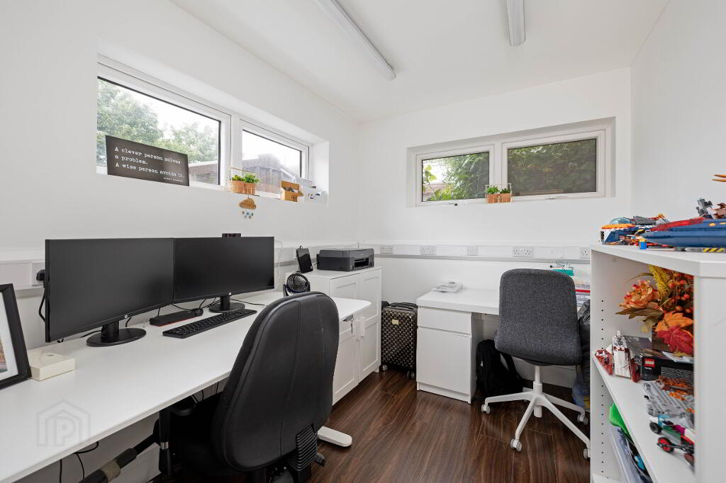 To the front, the property is enhanced by a generous tarmacadam driveway offering off-street parking for two vehicles. To the rear, a low-maintenance paved garden with a desirable south-easterly aspect provides an ideal outdoor retreat. The block-built unit, extending to approximately 21 sq. m., is thoughtfully laid out to accommodate a variety of uses.