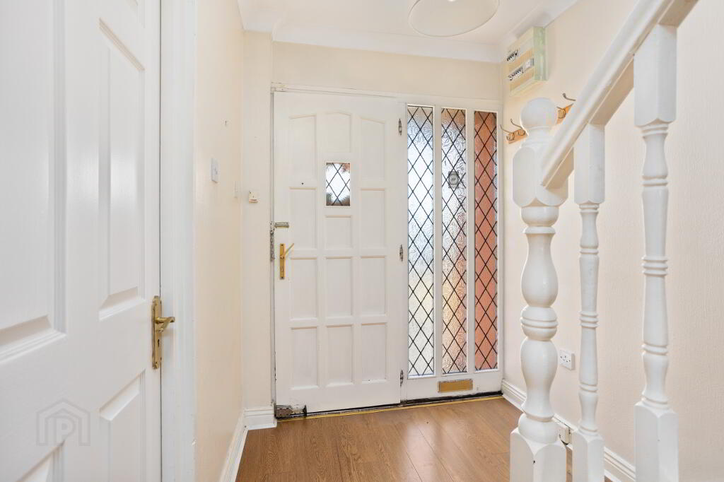 Entrance Hall: with laminate wood floor, alarm point and coved ceiling.