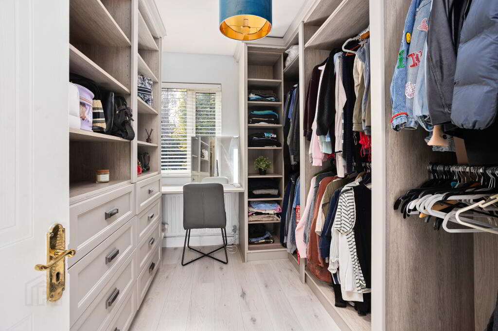Ample storage throughout including walk-in wardrobes, utility room with shelving.