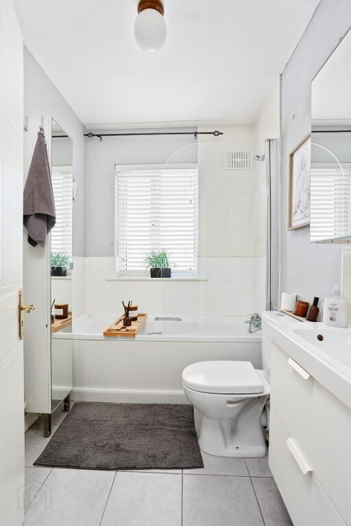 Family Bathroom: with tiled floor, wc, whb, bath, mounted vanity unit, window to rear.