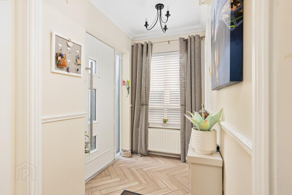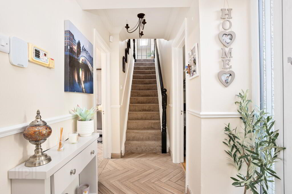 Entrance Hallway with alarm point, herring bone tiled floor, newly installed composite front door with multi-lock, curtains and blinds, ceiling coving, dado rail, feature side window for additional lighting to hallway.