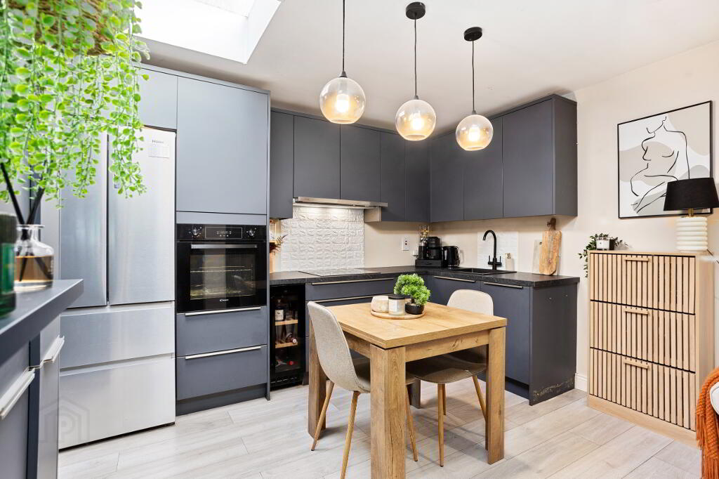 Kitchen / Dining Room: L-shaped with extensive range of quality dust grey kitchen units at floor- and eye- level (soft closing), Halifax oak work tops and upstands, new gas hob, Faber extractor fan, integrated new Beko dishwasher, integrated Electrolux oven, herring bone tiled floor, skylights, additional shelving in living area, wall lighting, access to utility room and access to rear garden.