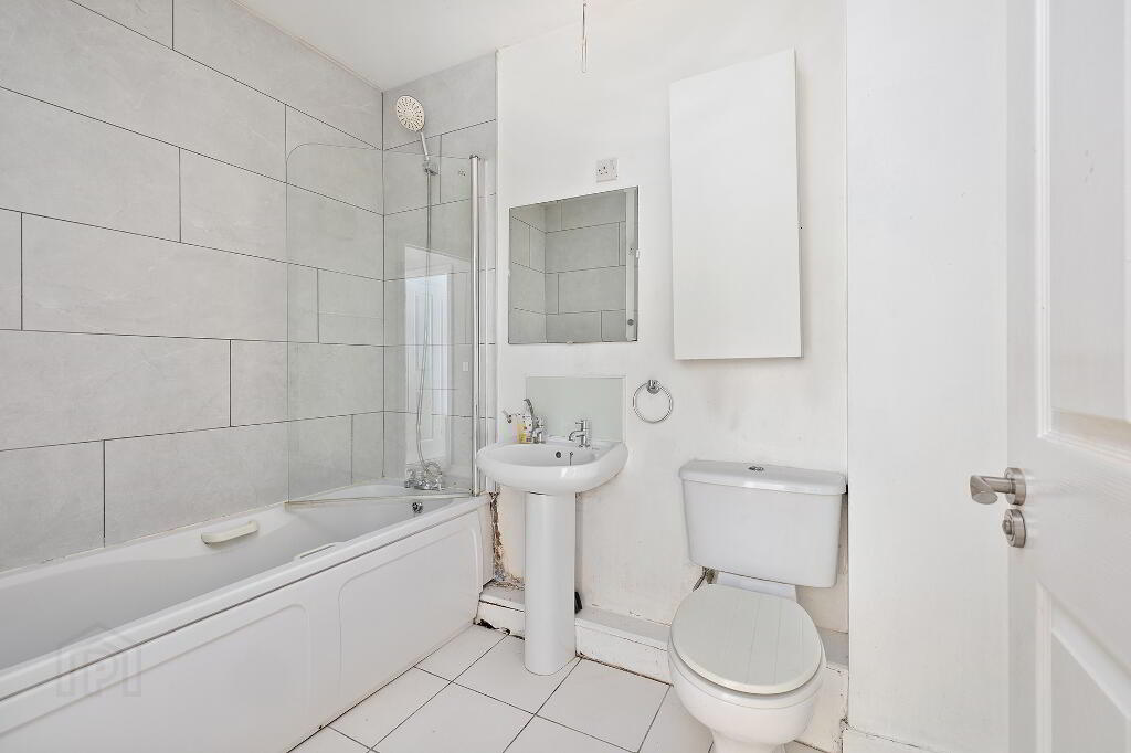 Bathroom: 2.45m x 1.69m partly tiled with tiled floor, WC, WHB and bath.
