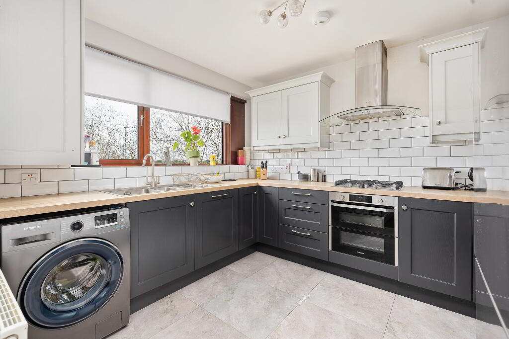 Kitchen: with tiled floor, tiled splash back, fitted shaker style kitchen units, integrated oven and gas hob.