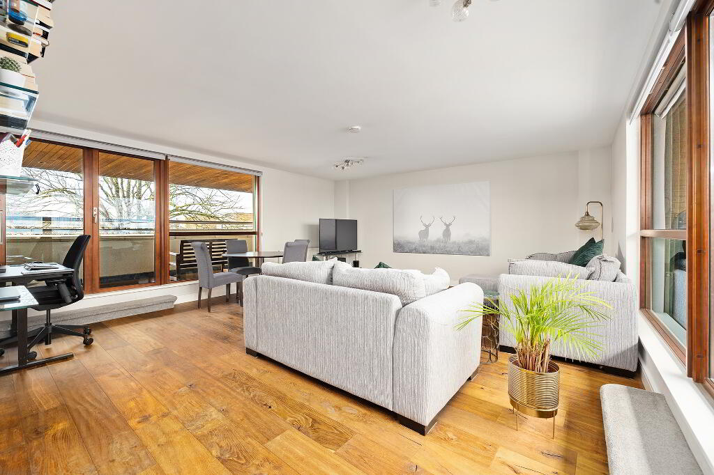 Reception Room: a dual aspect room with wood floor and access to two balconies.