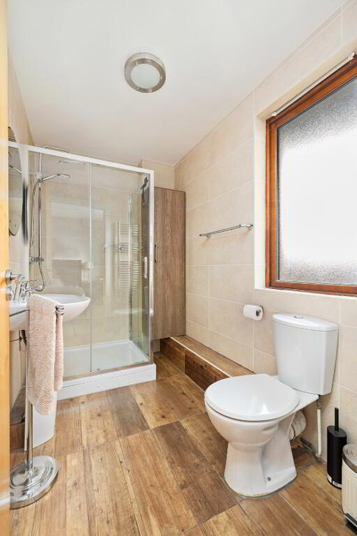 En-suite: fully tiled, tiled floor, WC, WHB, shower enclosure and fitted cabinet.