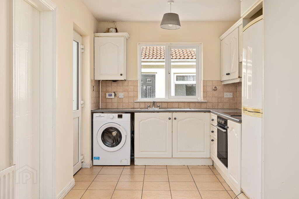 Kitchen with tiled floor, access to rear garden and fitted kitchen units at floor and eye level.