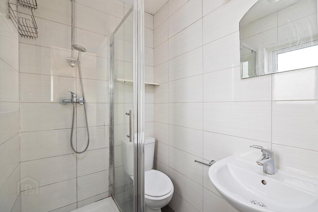 En-suite fully tiled, tiled floor, shower enclosure, WC and WHB.