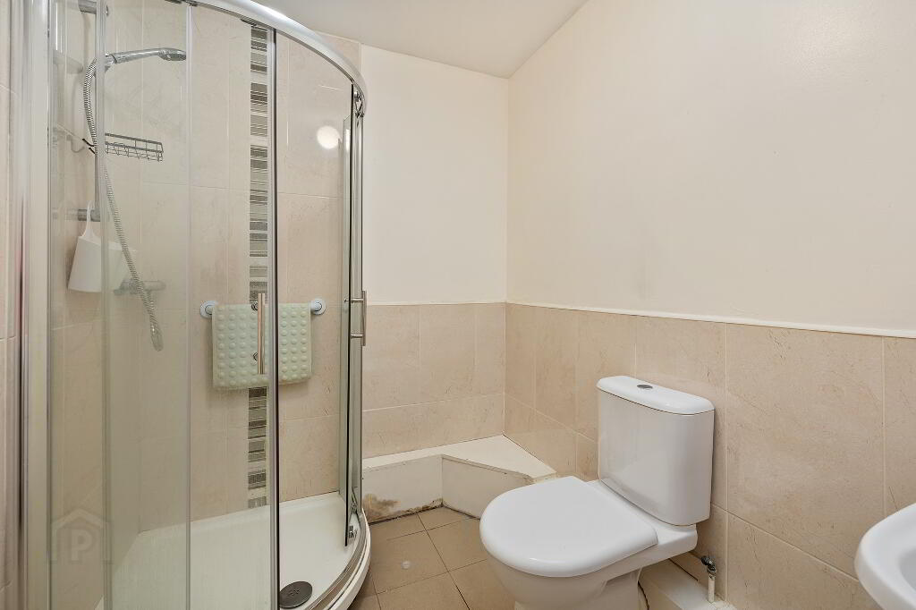 Bathroom: 2.53m x 1.71m with tilled floor, part tiled walls, shower enclosure, WC and WHB.