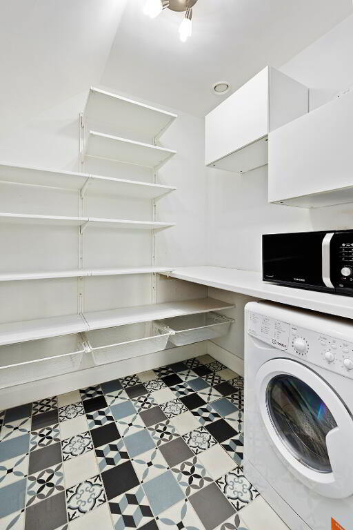 Utility Room: ample fitted shelving and storage units, Indesit washing machine, Climote control panel
