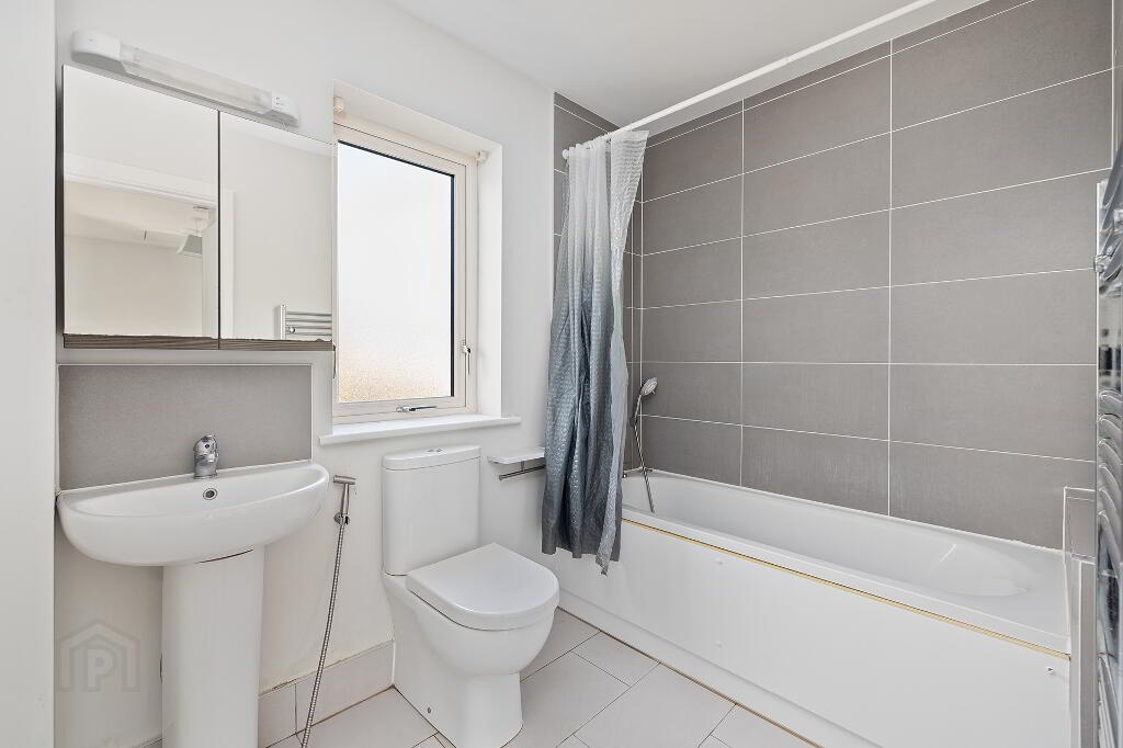 Ensuite: with fully tiled floor, fully-tiled enclosed shower unit, wc, whb, extractor fan, stainless steel radiator rail, window to side