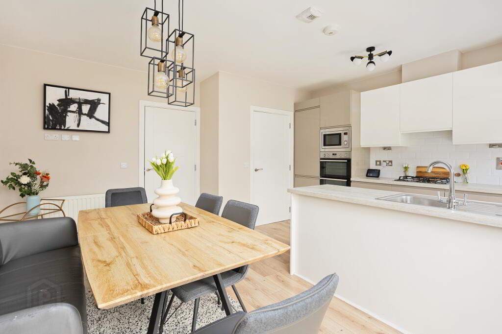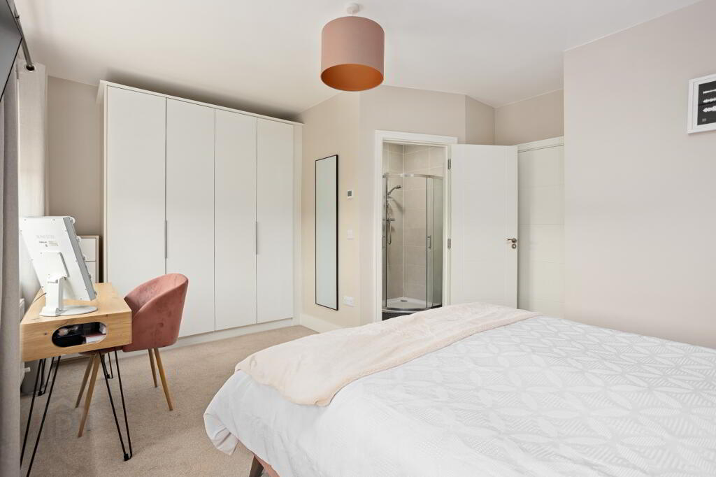 Extending to approximately 1,227 sq. ft (114 sq. m), the interior is tastefully finished in warm, inviting tones throughout. The accommodation comprises a welcoming entrance hall with guest WC and a convenient storage cupboard. To the front, a generously proportioned living room overlooks a charming amenity green and children’s play area. To the rear, a bright open-plan kitchen and dining area is complemented by a separate utility room. Upstairs, there are three spacious bedrooms, including a primary bedroom with en-suite, along with a well-appointed family bathroom.