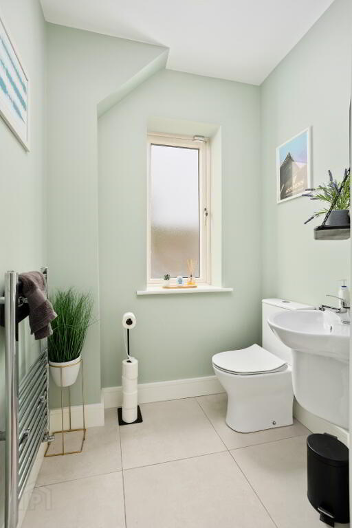 Guest WC: with tiled floor, WC, WHB and heated towel rail.