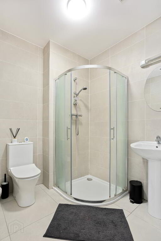 En-suite: fully tiled, tiled floor, WC, WHB and shower enclosure.