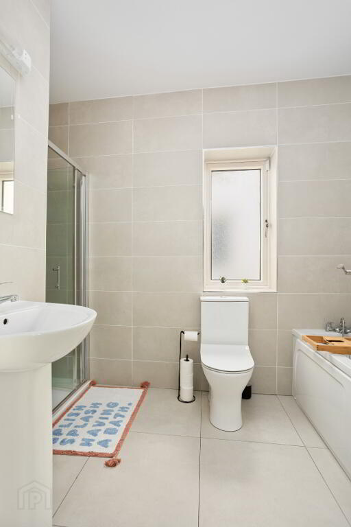 Bathroom: fully tiled, tiled floor, WC, WHB, shower enclosure and bathtub.