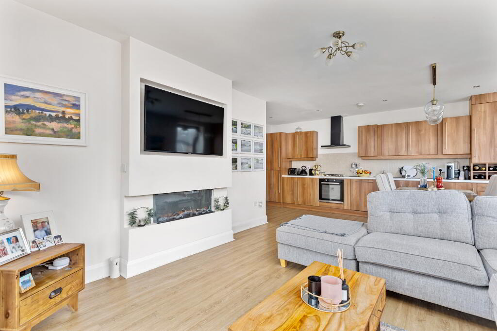 Kitchen/ Living Area: 6.49m x 5.24m (incl.) with wood floor, fitted kitchen units at floor and eye level, tiled splash back, in-wall recessed TV area, inset electric fire and and access to balcony.