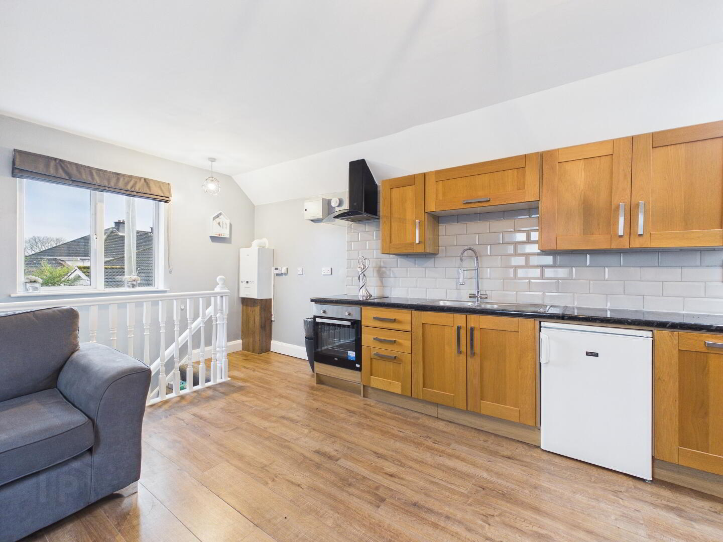 Open plan kitchen / living room with fully fitted kitchen.